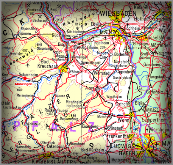 Wie man auf der Karte sehen kann, liegt Monzingen im Süd- westen Deutschlands, an der B41 von Bad Kreuznach nach Idar-Oberstein, zwischen Bad Sobernheim und Kirn.